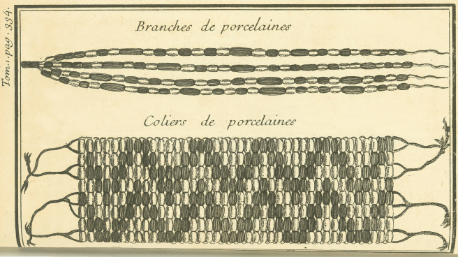 Lorsque les Sauvages de l’Amérique Septentrionale veulent faire quelque traité de Paix, ils ont cette maxime qu’ils ne [76] font jamais de convention qu’ils n’ayent vûs auparavant des presages qui puissent les assurer & les confirmer dans l’union que l’on veut faire avec eux. Cette ceremonie s’observe differemment, car lorsque les Sauvages qui tirent vers le Sud veulent annoncer la Paix, ils mettent en terre un bâton, ou un pieu, ou envoyent des colliers.