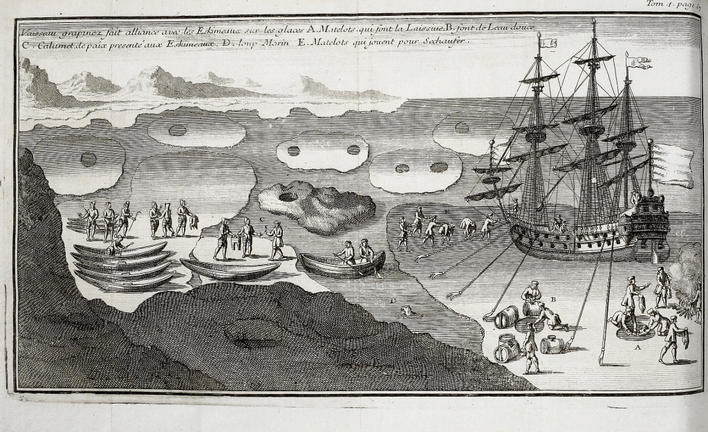 Martigni leur presenta donc à cet abord une Pipe en façon de Calumet, & une Boëte à tabac, fuma un petit moment, & leur donna à fumer. Les sept autres qui se tenoient toûjours à l’écart, voyant la bonne foi avec laquelle l’on agissoit avec eux, vinrent à lui avec des acclamations de joye, faisant des cris d’un ton de voix fort clair, sautans & se frottans l’estomac, qui étoient les marques les plus convaincantes d’amitié & du bon Commerce qu’ils [77] vouloient avoir avec nous. Il leur donna un couteau, & ils lui firent present d’un habit de peaux. Ils firent comprendre qu’ils avoient de quoi faire la traite : Mais, comme nous étions bien aise[s] de les avoir dans notre vaisseau, il leur donna à entendre qu’il n’avoit rien, les priant de venir avec lui. Quelques instances & quelque acueil qu’on leur fit, ils ne voulurent jamais s’i fier. Martigni se coucha sur la glace, leur montrant par là qu’il se donnoit pour ôtage, à condition qu’ils nous envoyassent un des leurs. Ils voulurent en avoir deux pour un, & Grandville Garde de la Marine resta aussi pour ôtage.